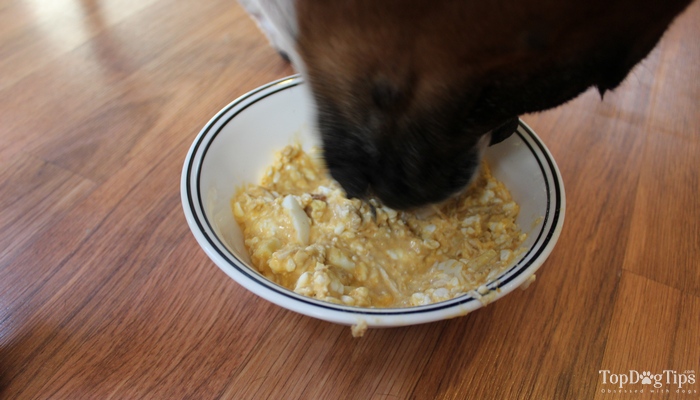 This recipe makes about 3 cups of dog food. You can serve it to your pet as soon as it is thoroughly mixed.