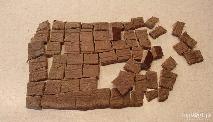 Once cooled, you should be able to remove the ‘loaf' from the parchment paper easily. You can use a pizza cutter to cut the loaf into small squares. As I explain in my video, one of the best things about making your own dog treats is that you can cut them into appropriate sizes for your pet. As you'll see, I cut some bigger squares for our Labrador and some smaller squares for our Beagle mix.