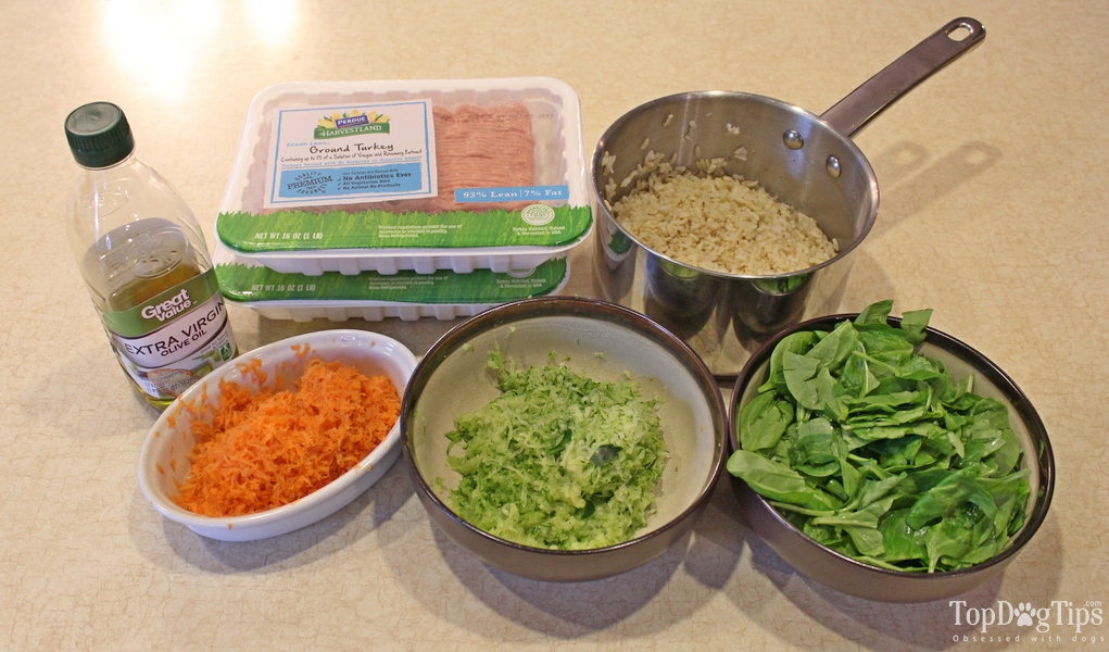 In a large pot, brown the turkey on medium heat, using the olive oil to keep it from sticking. You can also substitute coconut oil or any other dog-friendly cooking oil that you have on hand. While the turkey is cooking, crumble it with a spatula.