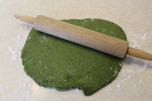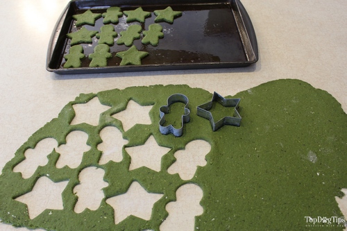 Once the dough is finished, roll it out on a floured surface. As you'll see in my video review, I use cookie cutters to make cute shapes. You could just use a butter knife or a pizza cutter to cut the dough into small squares. It doesn't really matter, because the don't won't care what shape they're in.