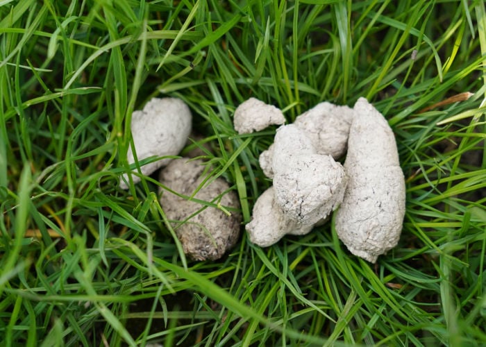 | White Poop | ![]() | Too much calcium | Common in raw food diet |