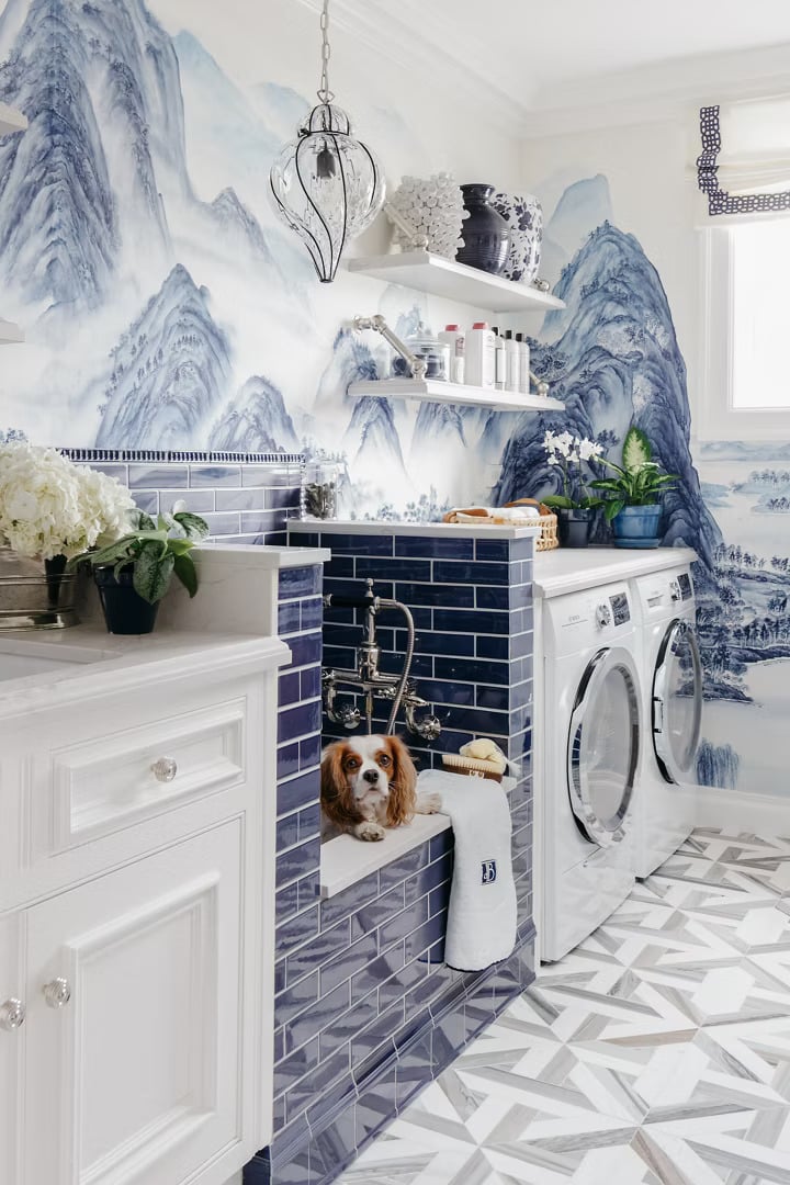 Get inspired by this elegant, blue-and-white-themed laundry area, designed by Dina Bandman.