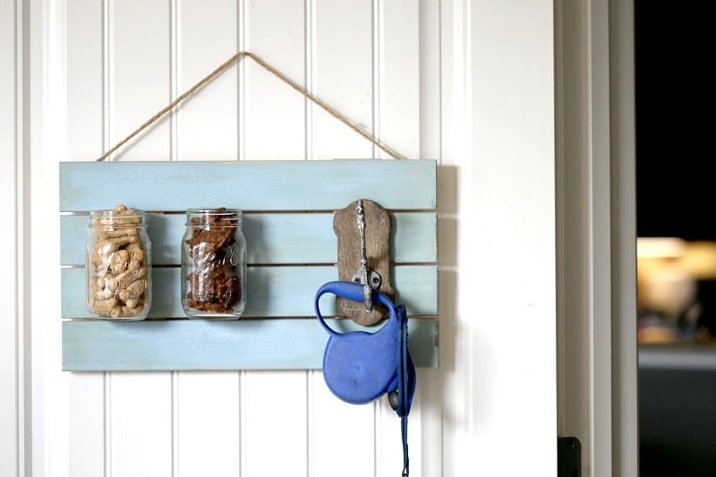 This simple project only requires a few materials and no carpentry skills. You can simply Gorilla Glue the jars to the wood, especially if the dog treats you will put in are not too heavy.