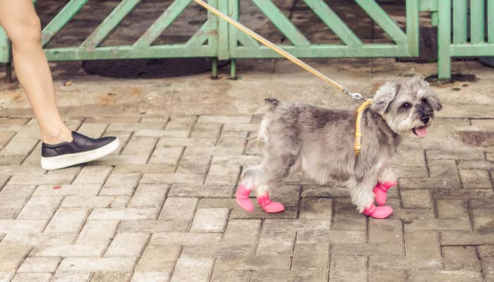 Use a well-fitted harness and dog boots when walking outdoors. If the weather is hot, make them wear cooling vests. If cold, then thermal jackets or coats can help warm them up.